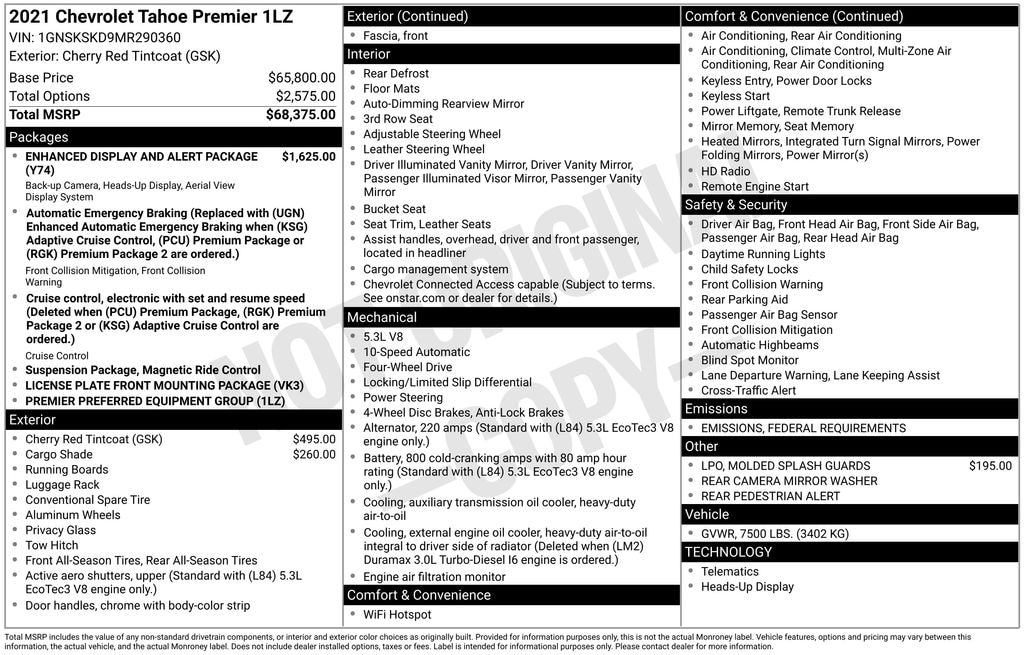 4D Sport Utility 2021 Chevrolet Tahoe Premier 4WD EcoTec3 5.3L V8 10-Speed Automatic with Overdrive