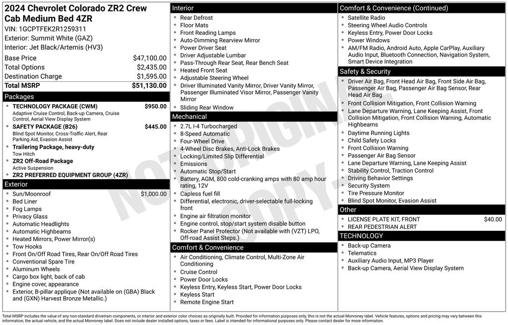4D Crew Cab 2024 Chevrolet Colorado ZR2 4WD 2.7L I4 Turbocharged DOHC 16V LEV3-ULEV50 310hp 8-Speed Automatic