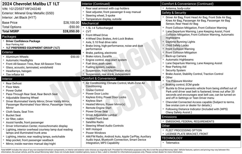 4D Sedan 2024 Chevrolet Malibu LT 1LT FWD 1.5L DOHC CVT