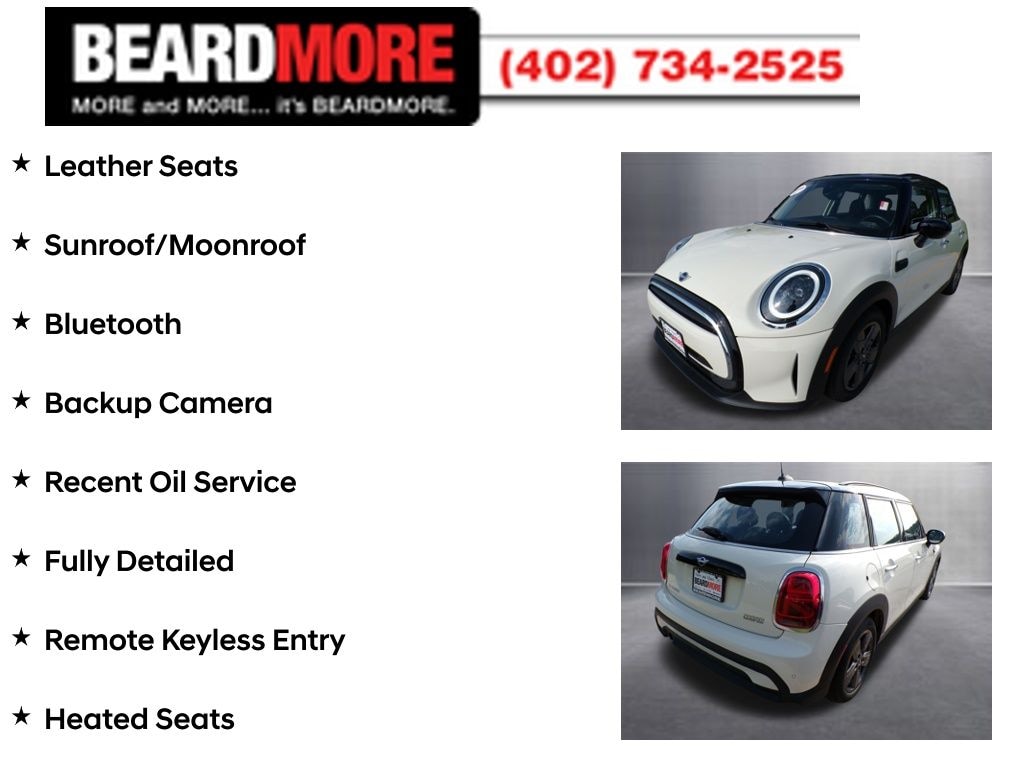 Pepper White 2023 MINI Cooper Base Certified. Leather Seats, Sunroof/Moonroof, Bluetooth, Backup Camera, Recent Oil Service, Fully Detailed, Remote Keyless Entry, Heated Seats, Steering Wheel Controls, ACCIDENT FREE AUTOCHECK. .....MORE and MORE... it's BEARDMORE.