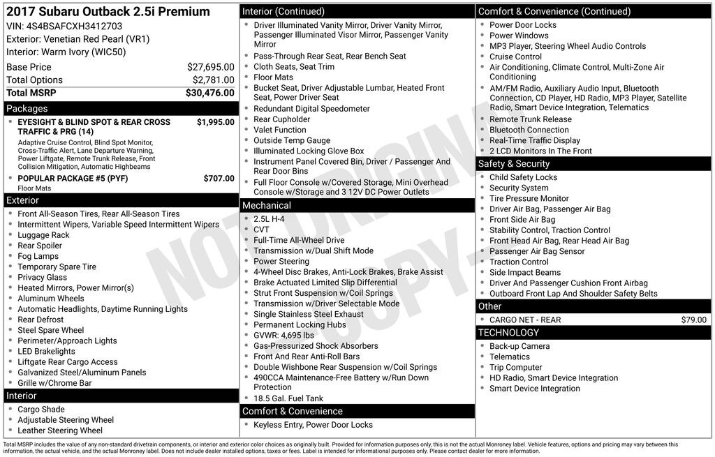 Venetian Red Pearl 2017 Subaru Outback 2.5i Premium Recent Arrival! Certified. Odometer is 5567 miles below market average! Bluetooth, Backup Camera, Recent Oil Service, Fully Detailed, Remote Keyless Entry, Heated Seats, Steering Wheel Controls, ACCIDENT FREE AUTOCHECK. .....MORE and MORE... it's BEARDMORE.