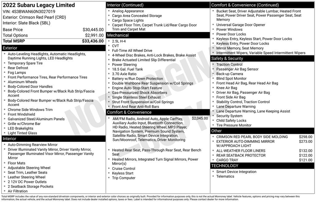 Red Metallic 2022 Subaru Legacy Limited Recent Arrival! Certified. Odometer is 27269 miles below market average! Recent Oil Service, Fully Detailed. .....MORE and MORE... it's BEARDMORE.