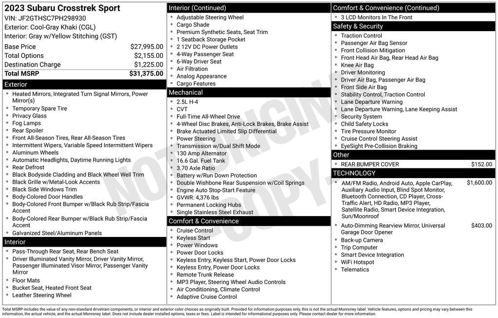 4D Sport Utility 2023 Subaru Crosstrek Sport AWD 2.5L 4-Cylinder DOHC 16V Lineartronic CVT