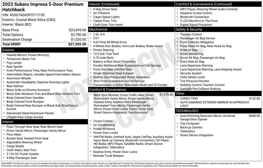 4D Hatchback 2023 Subaru Impreza Premium AWD 2.0L DOHC CVT Lineartronic