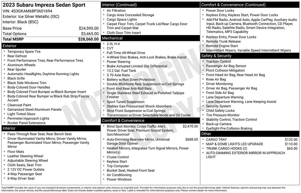 4D Sedan 2023 Subaru Impreza Sport AWD 2.0L DOHC CVT Lineartronic