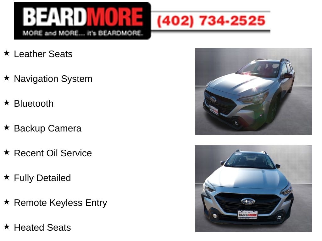 Ice Silver Metallic 2023 Subaru Outback Onyx Edition XT Certified. Priced below KBB Fair Purchase Price! Odometer is 14298 miles below market average! Leather Seats, Navigation System, Bluetooth, Backup Camera, Recent Oil Service, Fully Detailed, Remote Keyless Entry, Heated Seats, Steering Wheel Controls, ACCIDENT FREE AUTOCHECK. .....MORE and MORE... it's BEARDMORE.
