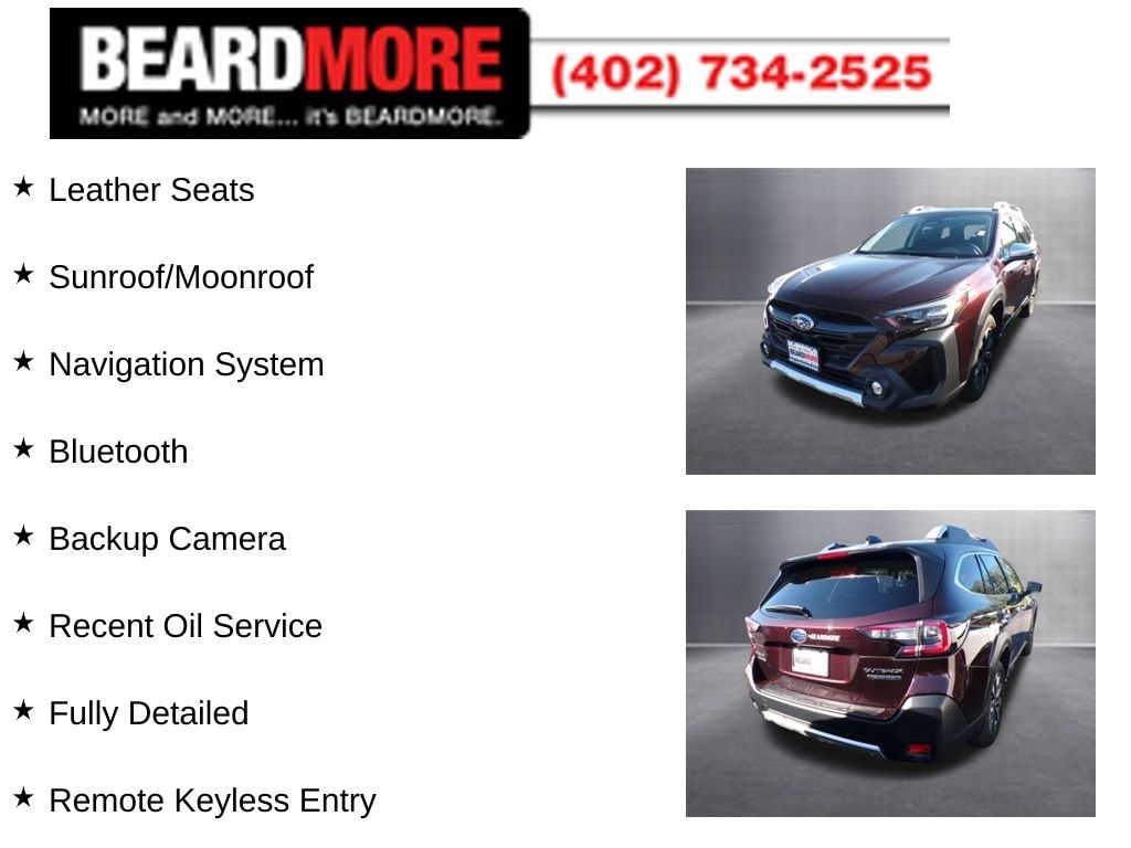 Dark Mahogany Pearl 2023 Subaru Outback Touring XT Certified. Priced below KBB Fair Purchase Price! Odometer is 5819 miles below market average! Leather Seats, Sunroof/Moonroof, Navigation System, Bluetooth, Backup Camera, Recent Oil Service, Fully Detailed, Remote Keyless Entry, Heated Seats, Premium Audio, Steering Wheel Controls, ACCIDENT FREE AUTOCHECK. .....MORE and MORE... it's BEARDMORE.